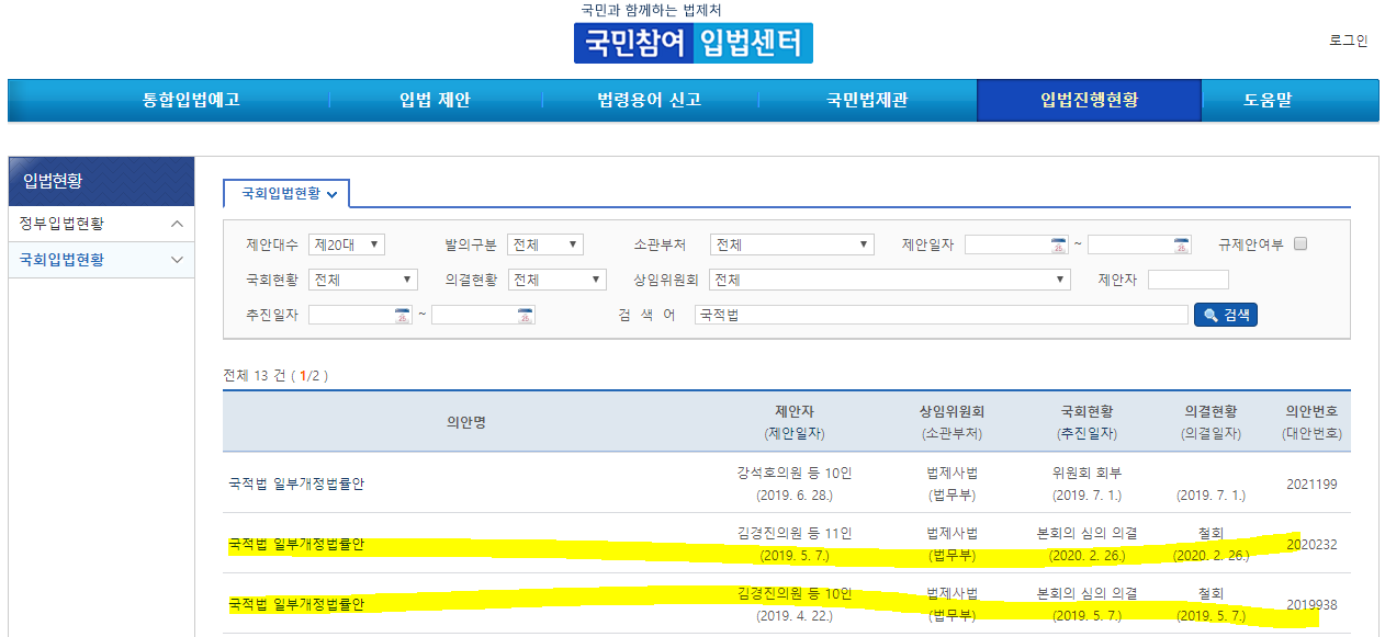 앞서 지난달 26일 법무부는 한국과 유대가 깊은 영주권자가 국내에서 낳은 자녀는 법무부 장관에게 국적 취득 신고만 하면 한국 국적을 얻게 되는 국적법 개정안을 입법예고했다. 미 하원, 북 개인∙기관 '소셜미디어 금지' 법안 발의. 더민주 소득 중심의 건강보험 개정안 오늘 발의 / ytn (yes! 법무부는 복수국적자(옛 이중국적자)의 국내 외국인 등록을 금지하는 국적법 개정안을 입법을 예고했다.4. 당정, 조만간 도시및주거환경정비법 개정안 발의 공공재건축에 대한 조합의 참여를 독려하기 위해 당정이 선도사업에 기부채납 비율을 최소화하는 등 각종 인센티브를 제공하는 방안을 추진 중인 것으로 알려졌다.